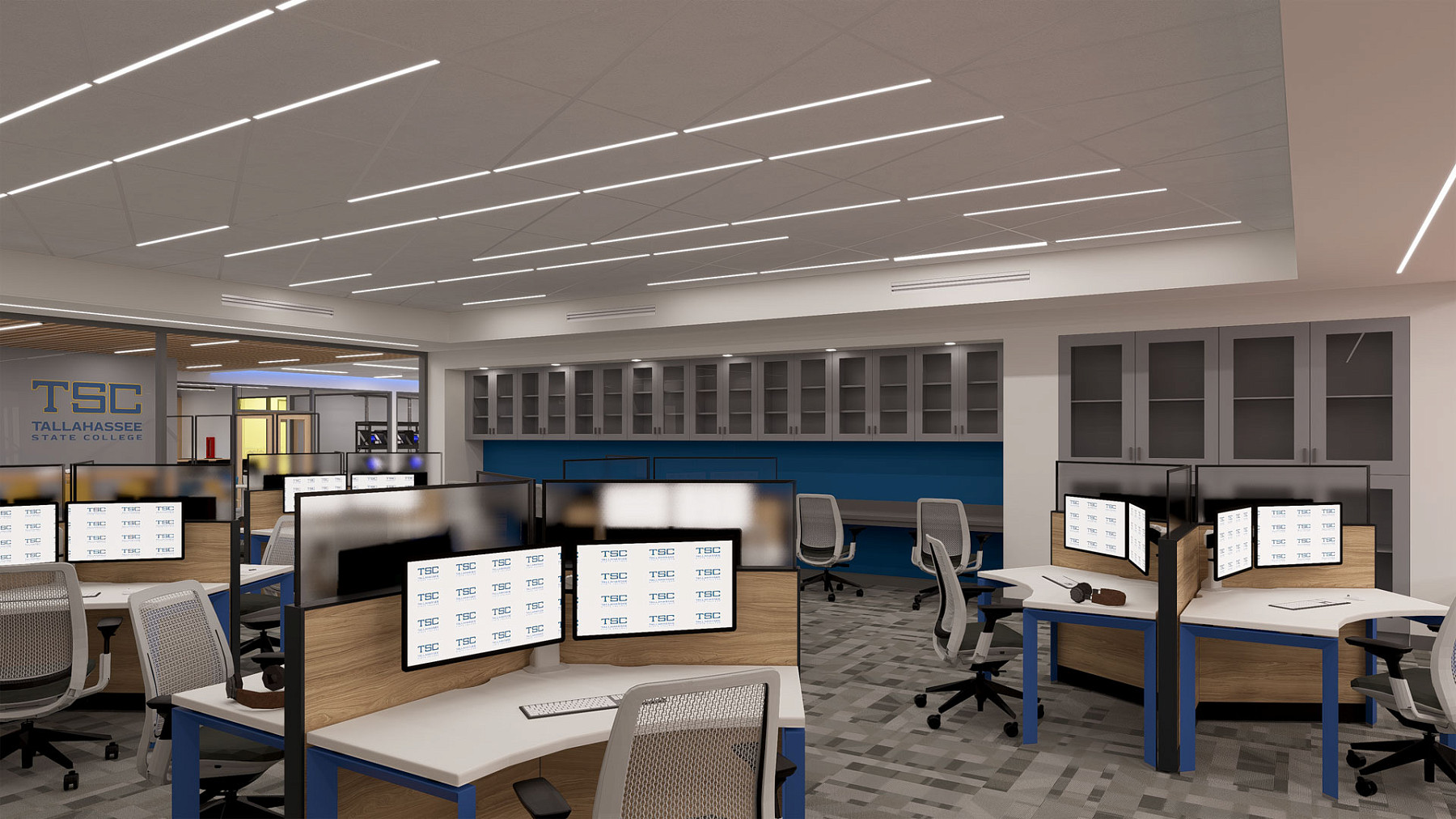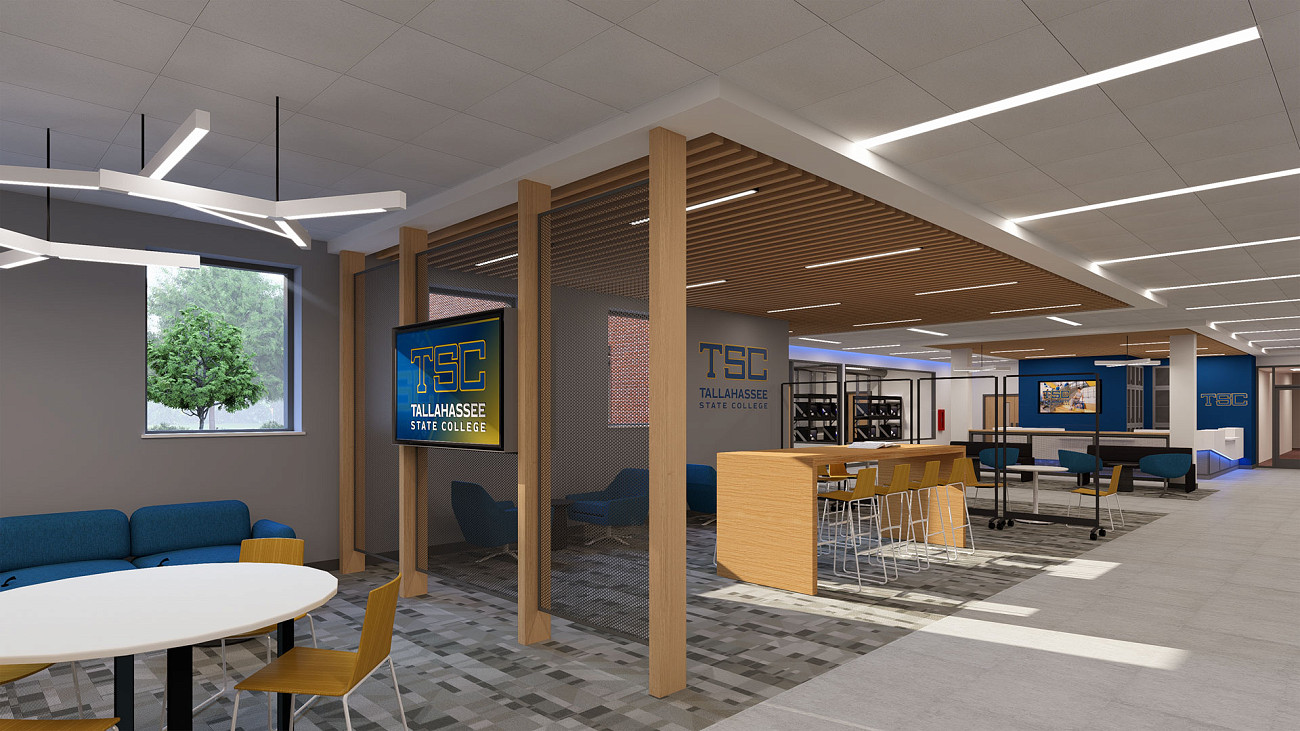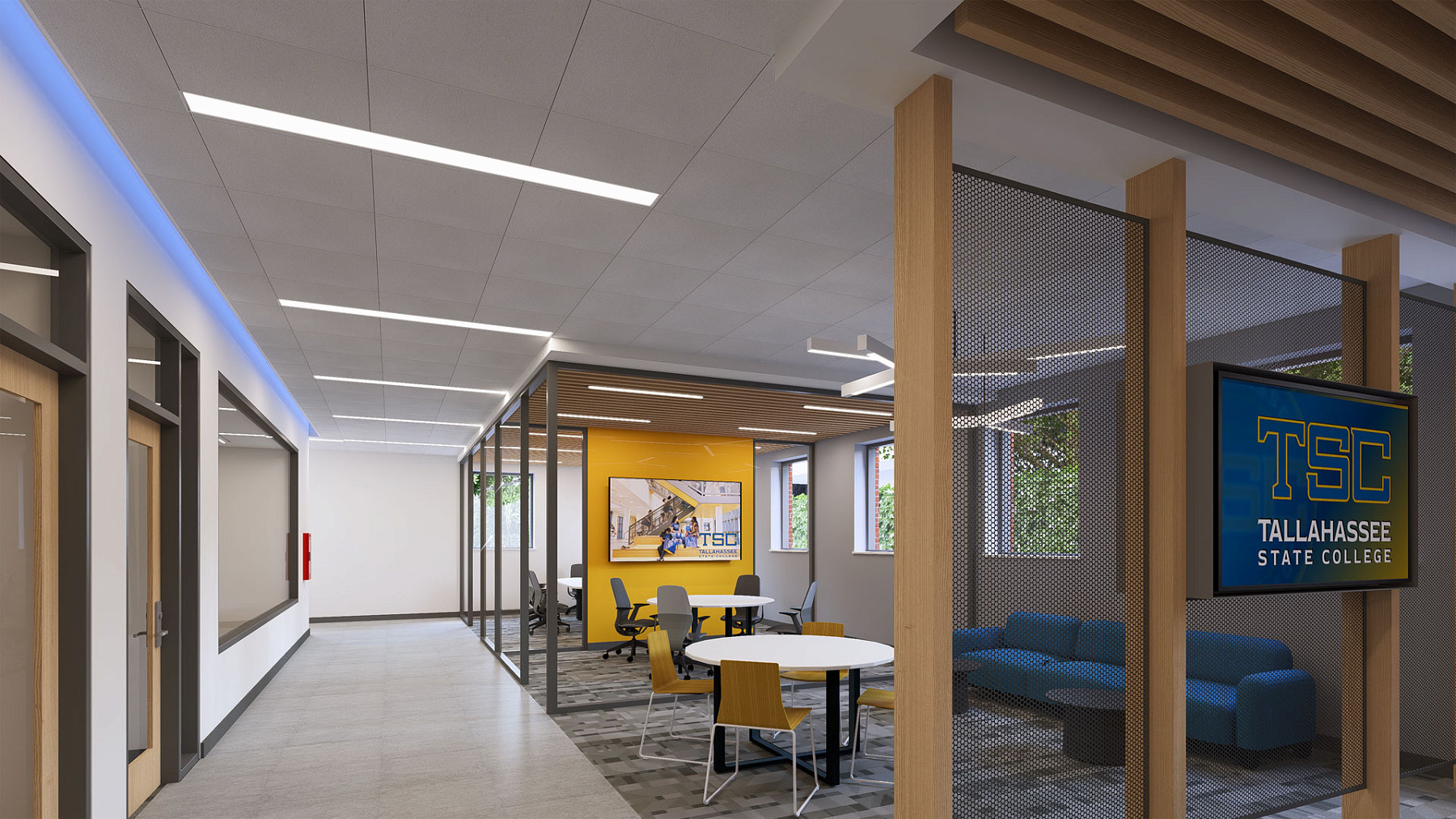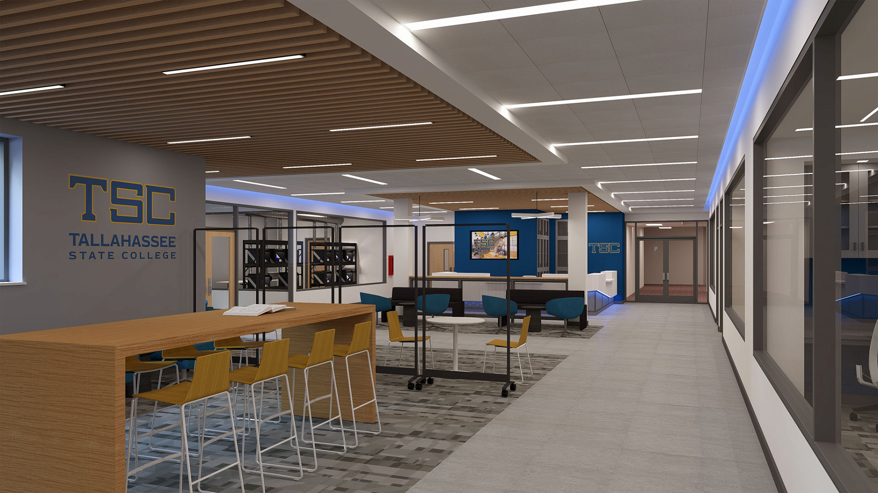 BKJ joined with Tallahassee State College to retrofit a portion of the school’s existing library to house a better use of today’s technology capabilities. A library is not just a place for books; it is intended to be a hub for all resources. TSC emphasized the importance of supplying the essential resources for their students by creating a space that reflects that idea. The Innovation Hub features an array of vocational areas dedicated to cloud computing, virtual and augmented reality (VR/AR), computer programming, business, and engineering technology that includes special rooms for 3D printing and semiconductor development as well, all of which are centrally located around the Collaboration Zone.