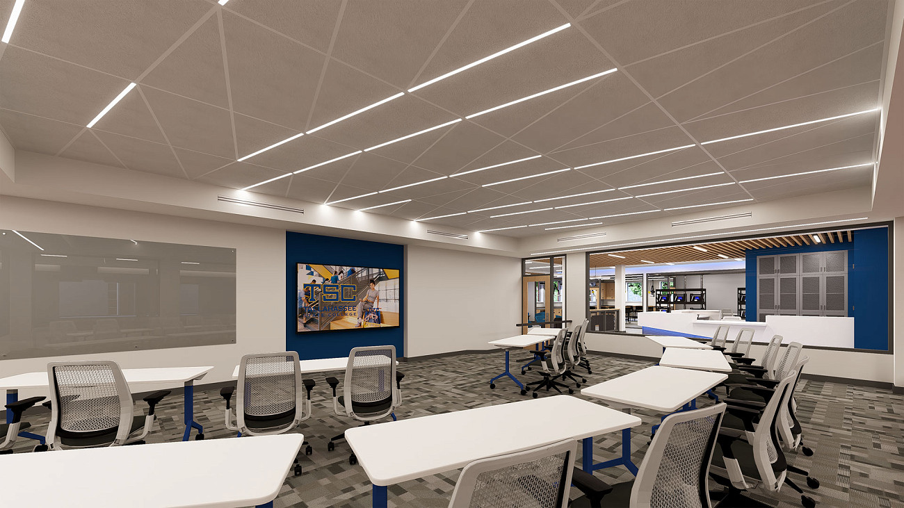 Dynamic ceiling patterns, accent walls, and distinct lighting arrangements give each vocational space its own identity while still maintaining a cohesive appearance overall.