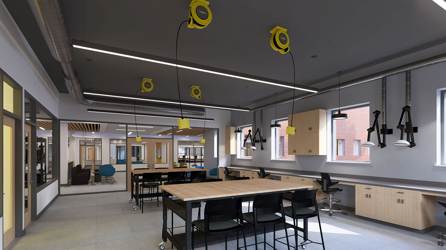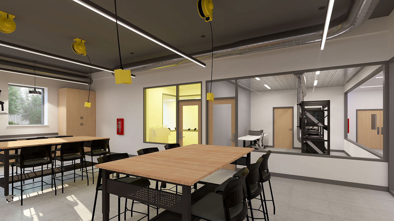 The engineering technology zone offers dedicated workspaces and plenty of storage for tools and equipment, promoting a well-maintained, creative environment for the students.