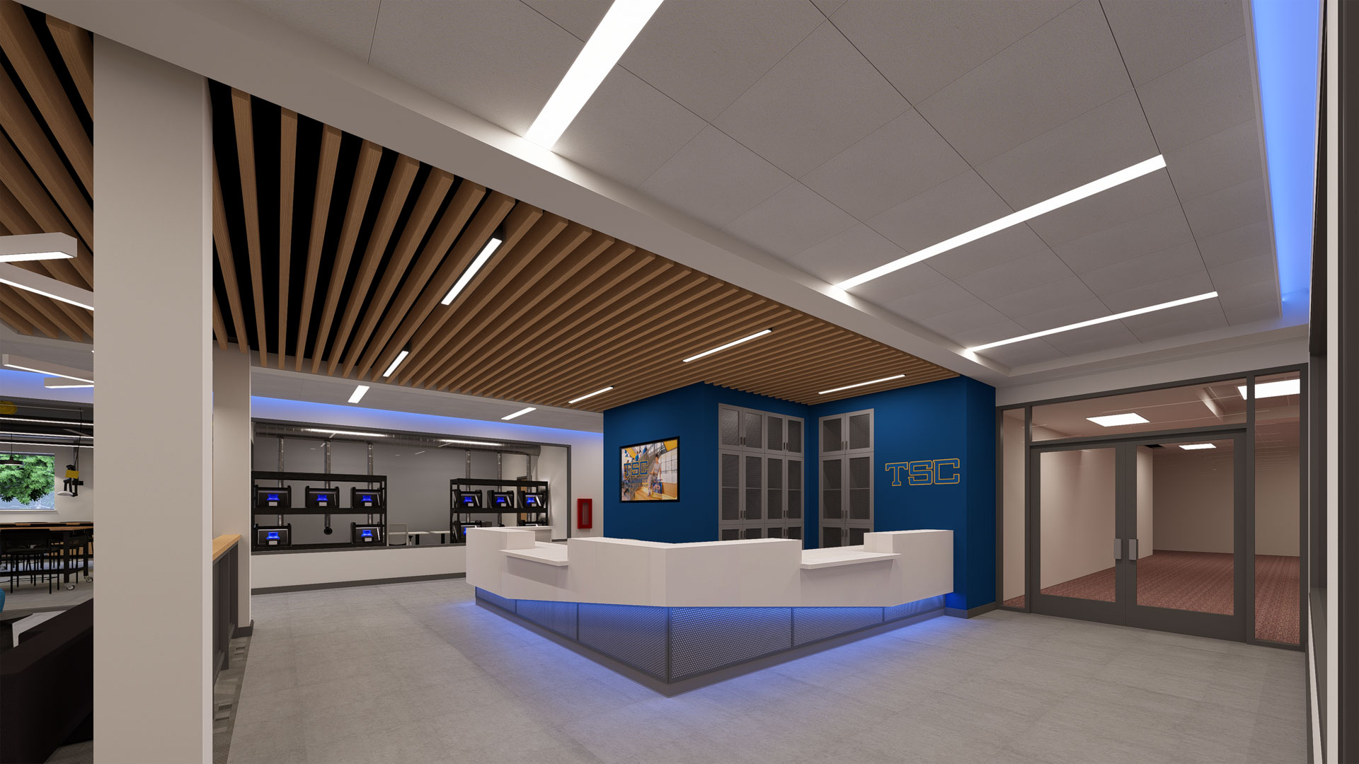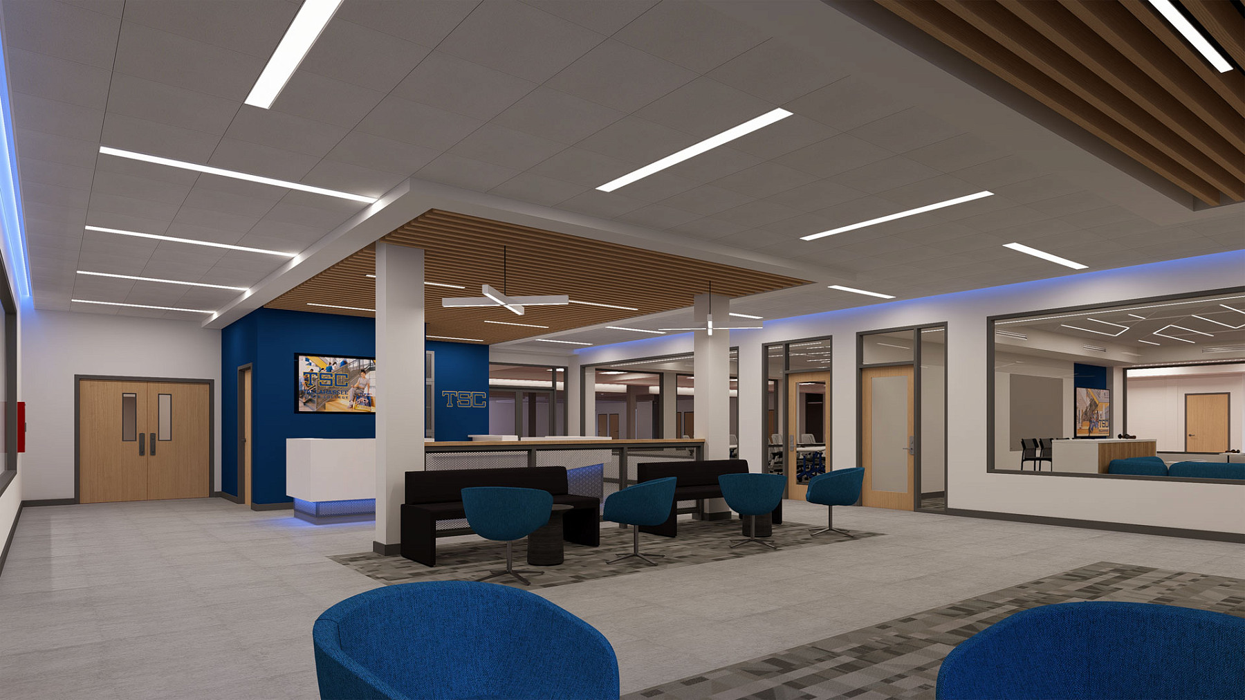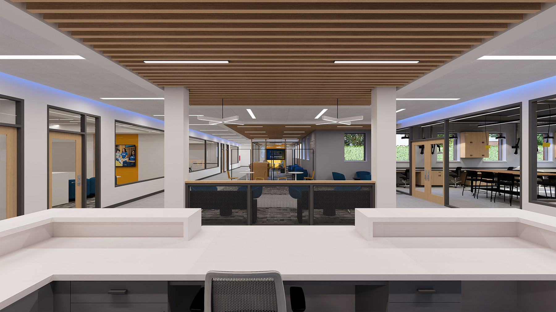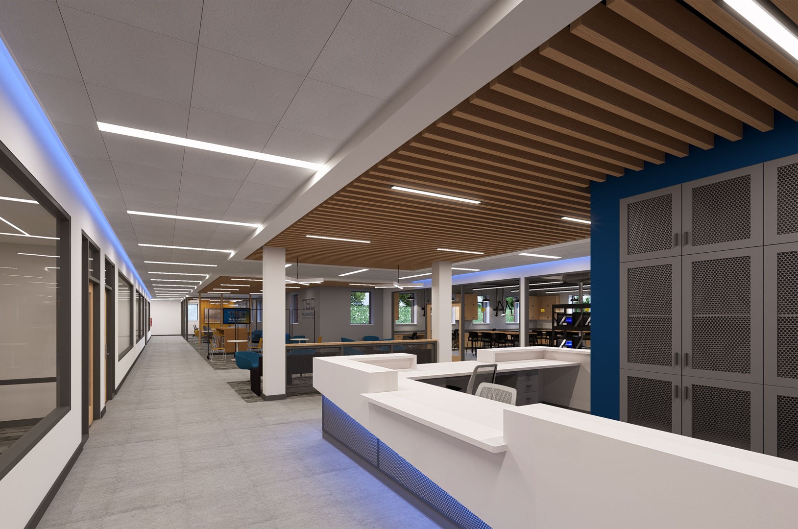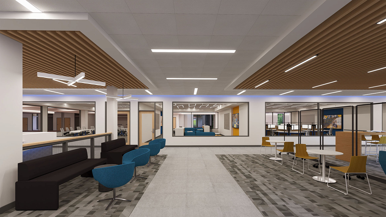 Wooden ceiling accents, custom monitor walls, and cheerful new furniture help form a new architectural palate as seen across the campus.