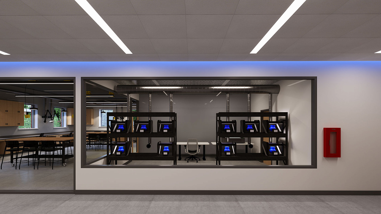 Students can see their own and classmates’ ideas come to life as the 3D printing lab showcases their creations in progress displayed through storefront systems.